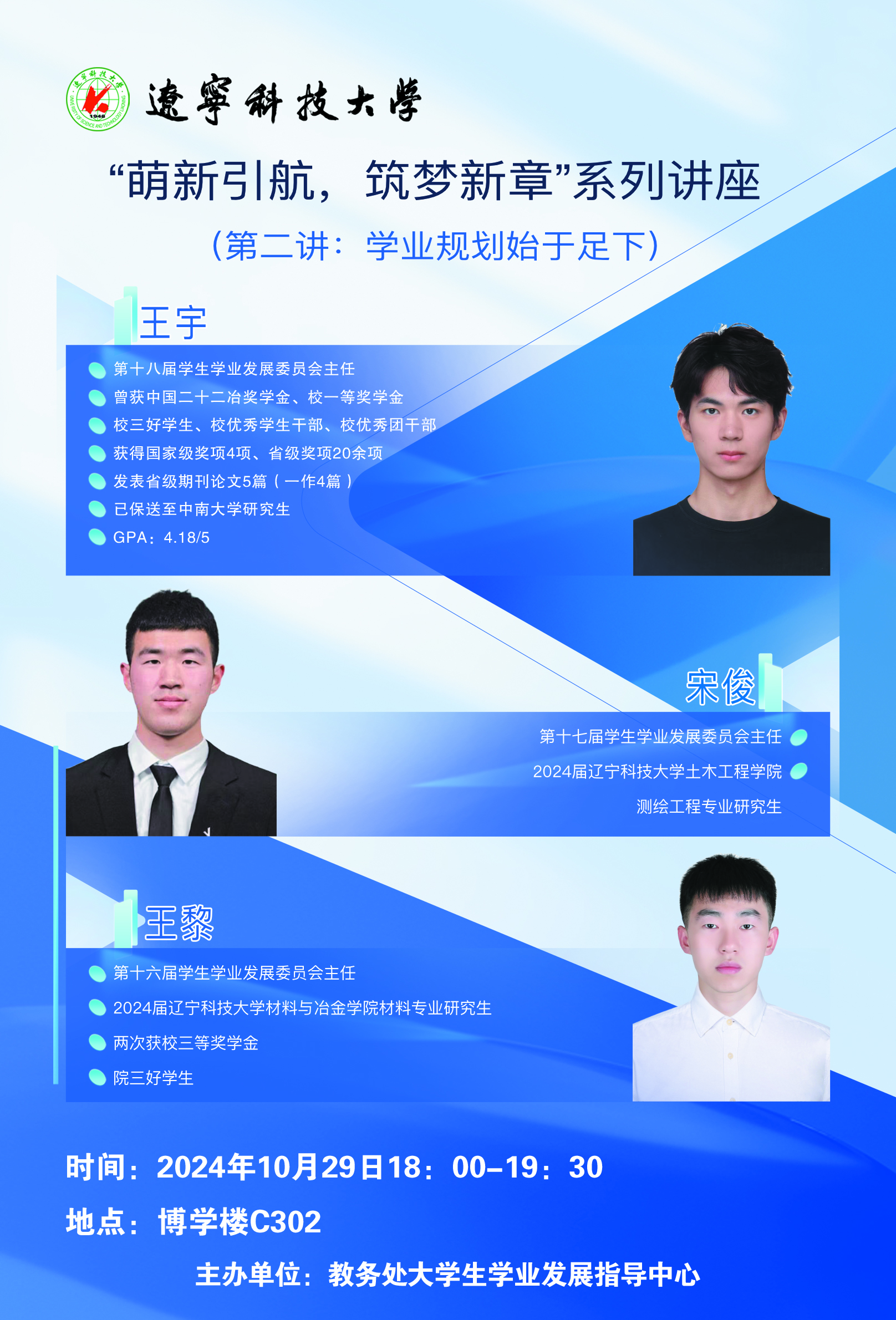 10月29日,教务处大学生学业发展指导中心面向2024级新生举办的“萌新引航,筑梦新章”系列讲座第二讲《学业规划始于足下》在博学楼C302教室开讲。J9平台学生学业发展委员会历届主任王宇、宋俊、王黎为学校300余名新生作讲座。