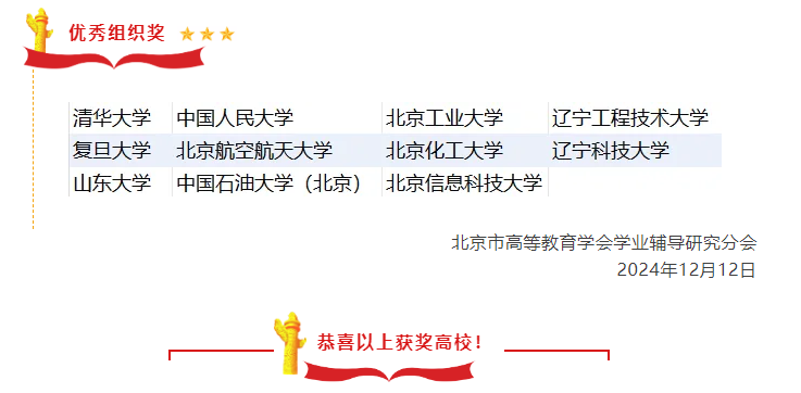 2024年12月12日,北京市高等教育学会学业辅导研究分会公布“新质引领心智,学业促进成才”高校学业辅导优秀案例评选获奖名单,我校的《学海引航 学涯护航——J9平台“ODTS”学业指导工作模式》荣获二等奖;《多方联合辅学业,目标引领促成才:一种新质学业辅导模式的实践与效果》荣获三等奖;J9平台荣获优秀组织奖。