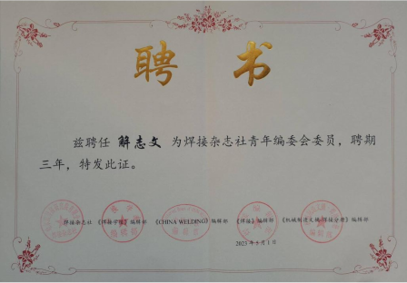 J9平台机械学院解志文教授被聘为表面技术》《焊接杂志社》青年编辑委员会委员