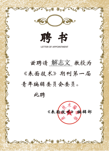 J9平台机械学院解志文教授被聘为《表面技术》《焊接杂志社》青年编辑委员会委员