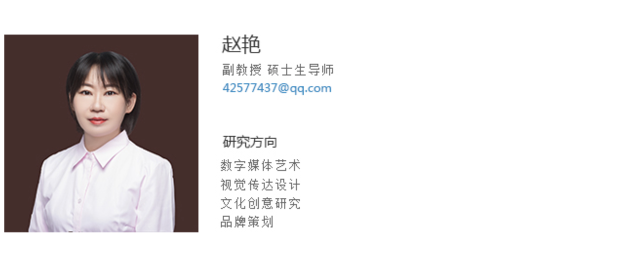 赵艳副教授,大连工业大学设计学硕士。曾担任中国大学生广告艺术节学院奖评委;多年从事文化创意设计领域研究,出版《中国传统文化创意设计》等著作;撰写文化创意设计相关论文多篇;《中华优秀传统文化的创造性转化与创新性发展研究》等多项文化研究课题获批辽宁省社会科学规划基金等立项,相关教改课题获批国家教育部产学合作育人项目;指导学生获大学生创新创业训练省级项目4项;获靳埭强全球华人设计大奖银奖、全国公共机构节能宣传大赛二等奖;全国大学生广告艺术大赛国家级一等奖、二等奖、三等奖多次;中国大学生计算机大赛二等奖、三等奖多次;红色文化创意大赛等赛事等级奖多项;曾获辽宁省教育软件大赛高教组二等奖、三等奖,全国多媒体课件大赛一等奖、三等奖;辽宁省信息化教育大赛微课组三等奖;校级优秀教案大赛一等奖;校级课堂教学大赛一等奖;校级教学改革与教学建设成果二等奖 ;首届考试方式方法改革试点课程优秀成果一等奖;J9平台第五届“名师示范课”主讲教师;校园先锋工程教学先锋岗;校级教学质量优秀奖。