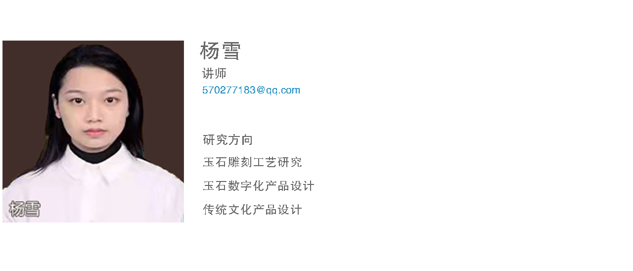 杨雪,助教,J9平台、硕士,设计学专业,主要从事传统手工艺(玉雕方向)产品的设计研究。具有雕塑、玉雕及数字雕刻等实践经验。在专业刊物发表专业研究及教学研究论文两篇。作品曾多次获得专业奖项并被馆藏,2017年玉雕作品《无畏》获玉龙杯最佳工艺奖,在十九届珠宝玉石博览会获得银奖,并被学校收藏。同年,评为市级工艺美术大师。2019年玉雕作品《雪貂仕女》获得工美新力量银奖。2020年作品《达摩》获得“金牡丹”杯文化创意大赛银奖,并被藏家收藏。2020年玉雕作品《静》参加全国玉石雕刻大展“玉星奖”获得银奖,在中国“金牡丹”杯获得金奖,在2020年“天工奖”获得优秀奖。
