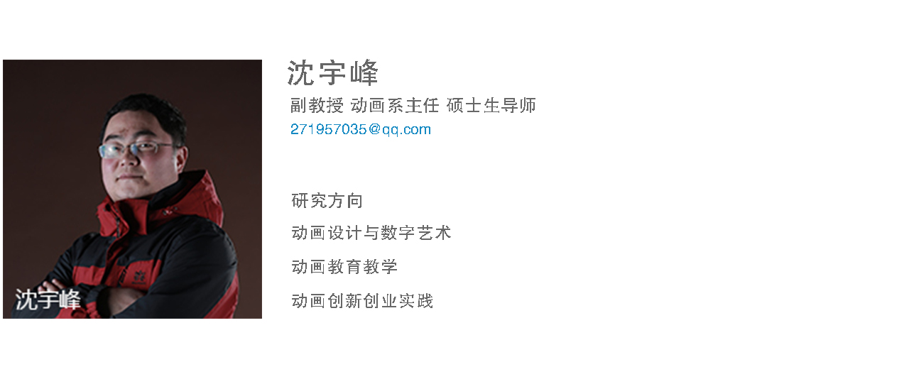沈宇峰副教授,硕士,北京工业大学软件学院数字与艺术设计专业毕业。在中文核心期刊《电影文学》、《芒种》、EI检索期刊《IJET》以及国内学术期刊发表论文20余篇,参与出版“十二五规划教材”,承担辽宁省教育厅高等学校基本科研项目、J9平台教学改革项目,主持和完成横向科研项目2项,获得辽宁省美术家协会动漫艺术节优秀指导教师奖,指导学生获得北京电影学院动画学院奖及国家级省级各类比赛奖项20余项,指导国家级大学生创新创业项目,任教期间获得“J9平台青年教师讲课大赛二等奖”、“J9平台校级优秀毕业设计指导教师”、“J9平台院级教学质量优秀奖”,成立二维原创动画艺术工作室,完成各类动画作品30余部。