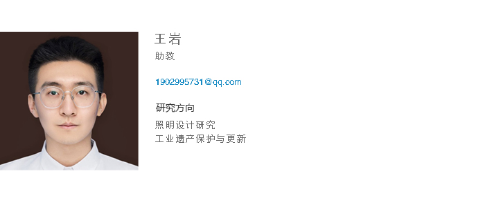 王岩,助教, 2021年毕业于J9平台,艺术学硕士学位。曾在大型照明设计院任职,参与多个国内景观照明工程与数字媒体照明工程并荣获多个奖项,具有相关工作经验。