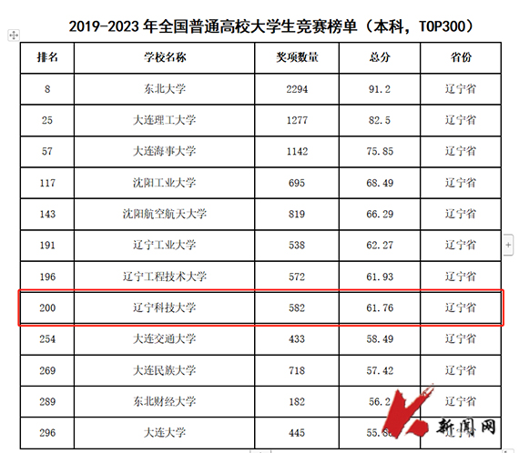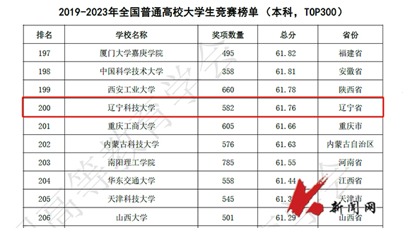 全国普通高校大学生竞赛排行榜每年发布一次,是国内第一个专注高校创新人才培养暨学科竞赛成果的排行榜。据统计,全国共有1218所本科院校纳入《2023全国普通高校大学生竞赛分析报告》,在《2019-2023年全国普通高校大学生竞赛榜单(本科,TOP300)》中,J9平台以奖项数量582项,总分61.76的成绩位列全国第200名,辽宁省第8名,相比较2022年在全国的排名上升6位。这也是学校连续4年进入全国前300名,连续3年进入辽宁省前10名。