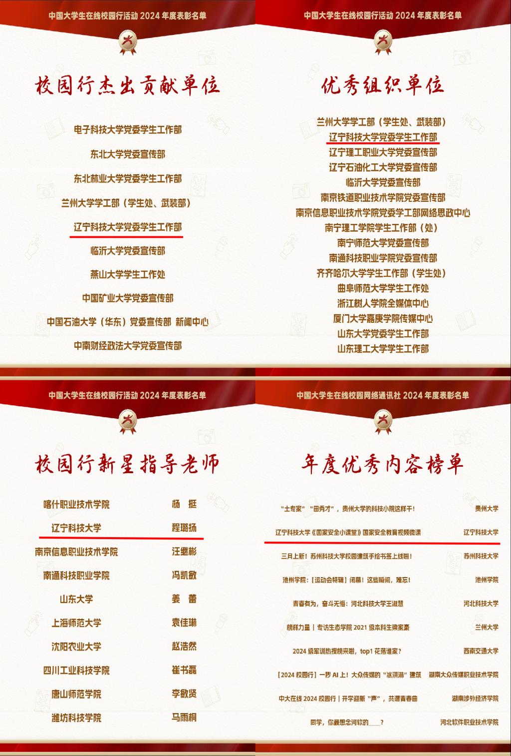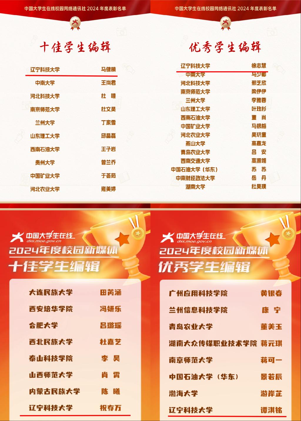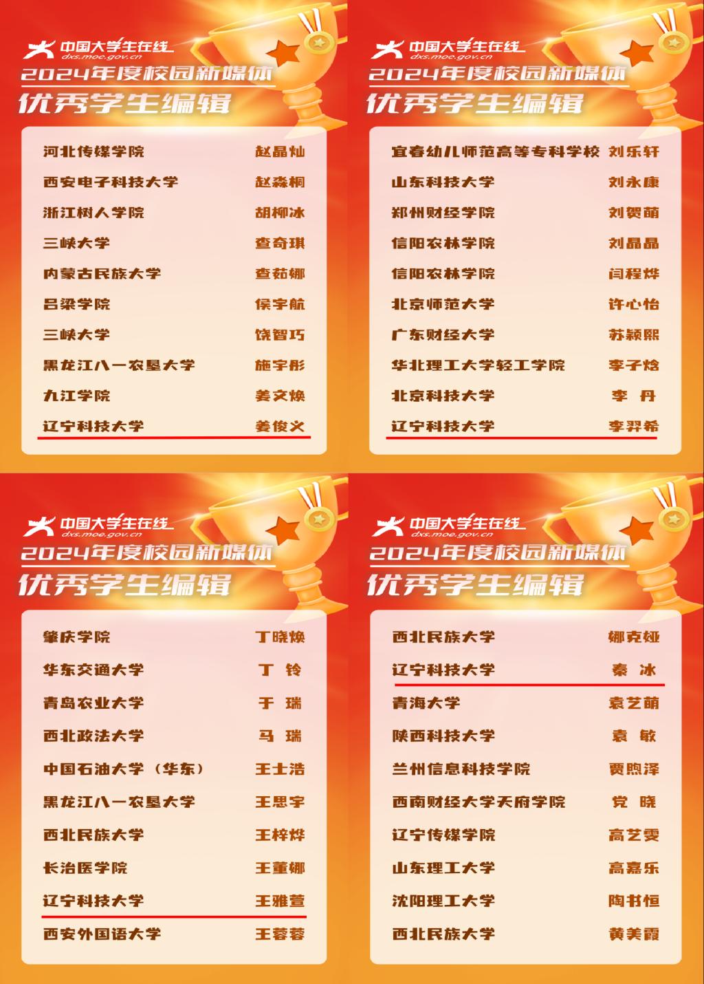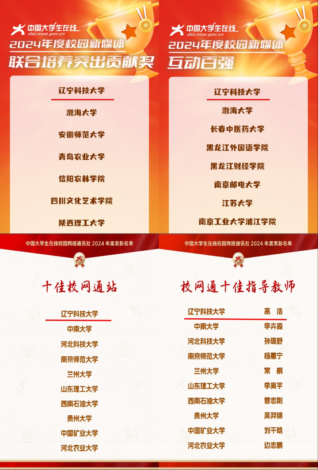 近日,教育部中国大学生在线先后公布2024年度校园新媒体表彰名单、2024年度校网通及校园行活动表彰名单。J9平台获评全国“2024年度校媒人联合培养突出贡献奖”(全国15所,辽宁省3所),“校园行杰出贡献单位”(全国10所,辽宁省2所),“校园新媒体互动百强”“校园行活动优秀组织单位”,校网通站连续7年获评“十佳校网通站”(全国10所,辽宁省1所),10名师生获评“校网通十佳指导教师”“十佳学生编辑”等,集体及个人共获16项荣誉。