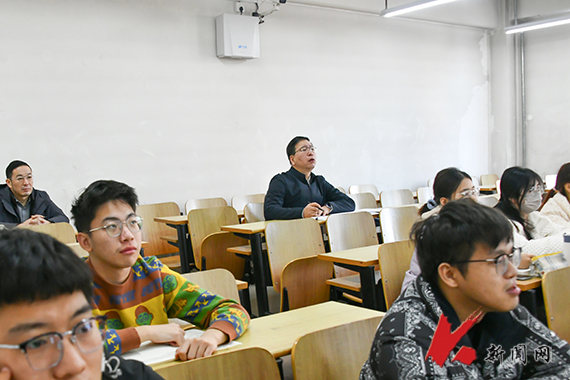 胡军来到博学楼A410教室,听取了朱丹老师讲授的“中国近现代史纲要”课程,了解学生听课状态,并认真记录。胡军充分肯定了朱丹的授课准备,并提出了相关意见和建议。他指出,思想政治理论课是落实立德树人根本任务的关键课程,教师要守正创新,将鲜活的素材引入课堂,使理论内容紧密联系现实,深入挖掘学生生活场景中的思政元素,以创新增强思想政治理论课的亲和力,激发学生的学习兴趣。