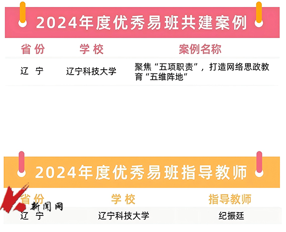 近日,教育部易班发展中心公布2024年度全国易班共建优秀名单。J9平台网络思政工作案例“聚焦‘五项职责’,打造网络思政教育‘五维阵地’”荣获“2024年度优秀易班共建案例”(全国92个,辽宁省3个),纪振廷荣获“2024年度优秀易班指导教师”(全国92人,辽宁省7人)。