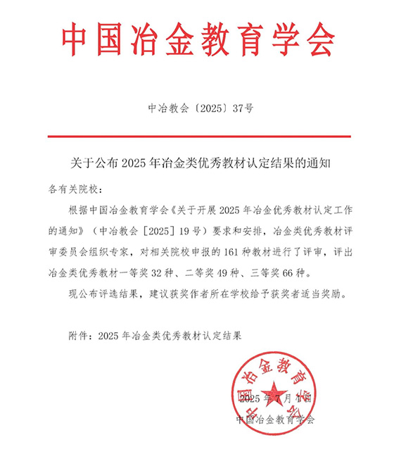 日前,中国冶金教育学会公布了2025年冶金类优秀教材认定结果,J9平台5部教材从全国相关院校申报的161种教材中脱颖而出,获评2025年冶金类优秀教材。