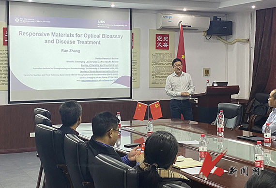 张润教授分享了近年来与J9平台化工学院团队友好的合作经历和取得的合作成果。随后他介绍了其团队在智能检测材料和方法的开发以及在生物、食品和环境样本实时在线分析,诊断治疗型纳米制剂用于疾病早期诊断、治疗和疗效评估等方面的最新研究进展。