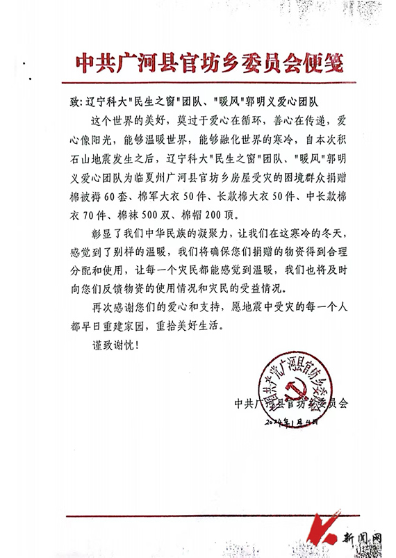 在海城市西柳镇党委的协调和帮助下,“民生之窗”团队、“暖风”郭明义爱心团队在西柳镇以成本价购得棉被褥60套、军大衣50件、长款棉大衣50件、中长款棉衣70件、棉裤70件、棉袜500双和棉帽200顶,并将救灾物资第一时间发往甘肃临夏州积石山县、广河县等地,为灾区人民送去温暖。