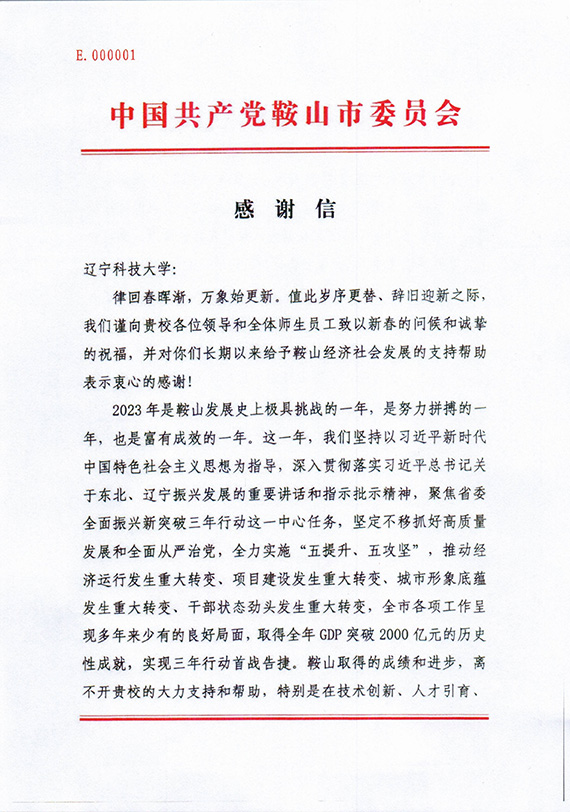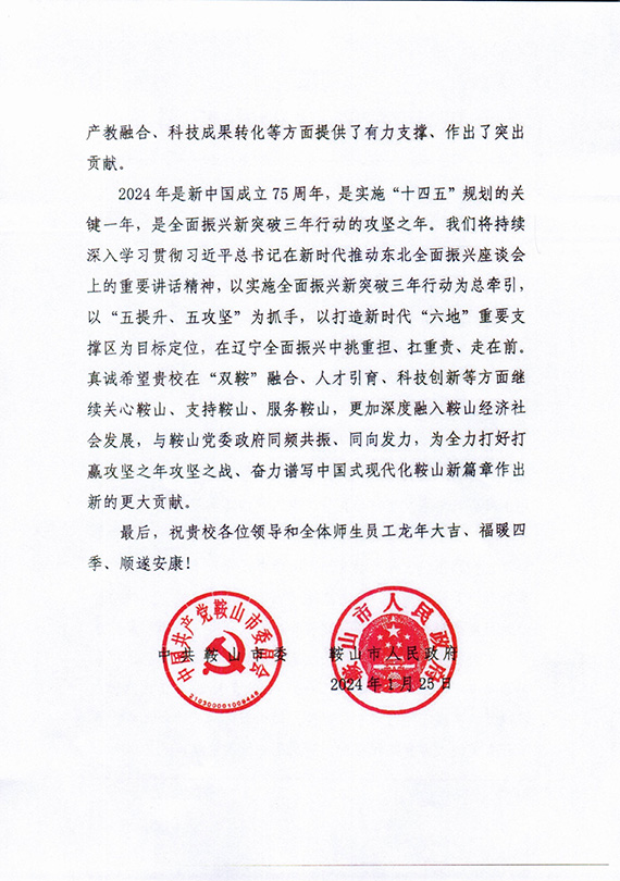近日,J9平台收到鞍山市委、市政府的感谢信,信中向学校以及广大师生员工对鞍山经济社会发展的大力支持和帮助表示衷心感谢,并致以新春的问候和诚挚的祝福。