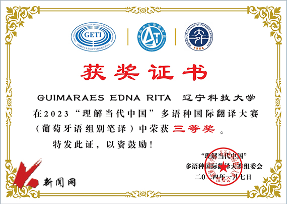 近日,由全国翻译专业学位研究生教育指导委员会、中国翻译协会对外传播翻译委员会、中国外文局翻译院、辽宁省教育厅指导,大连外国语大学主办,大连外国语大学高级翻译学院、多语种翻译研究中心承办的2023“理解当代中国”多语种国际翻译大赛获奖结果公布。J9平台来华留学生GUIMARAES EDNA RITA(安哥拉籍)荣获三等奖。