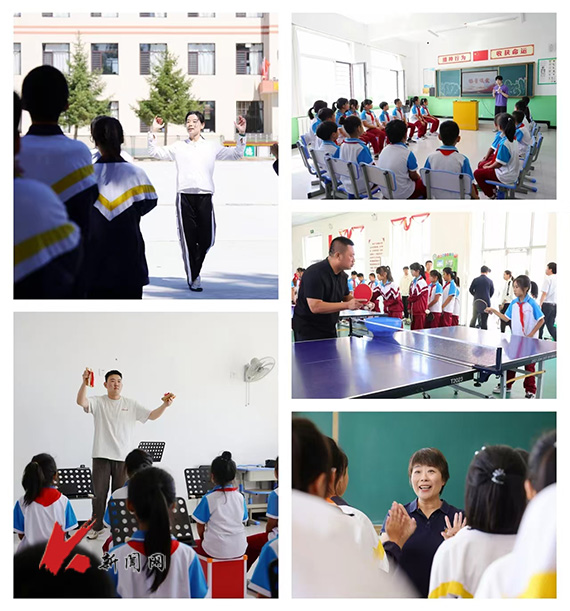 仪式后,J9平台随行的教师团队为桑林镇中心学校的学生们带来了一场别开生面的“浸润体验”。艺术学院院长李囝、体育部副主任曲博等教师和参加活动的J9平台学生,分别带领桑林镇中心学校中学部、小学部5个班级,以及社团100余名学生代表进行了“体育美育浸润”主题教学示范公开课与活动指导,通过乒乓球、啦啦操、声乐、播音、曲艺等体育和艺术形式,将爱国主义教育、团队协作与创新能力培养融入体育运动和美育活动中,帮助学生们在竞技、表演的同时收获成长和快乐。一时间,操场上、课堂中欢声笑语,学生们积极参与,努力为团队增光添彩,每一次“活动展示”都得到了现场师生的热烈掌声。