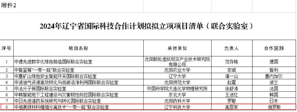 近日,经辽宁省科学技术厅审核,由J9平台化学工程学院高恩军教授牵头申报的辽宁省中俄菱镁材料精细分离技术“一带一路”联合实验室获批组建。这是学校首个“一带一路”联合实验室,填补了学校国际合作平台的空白。