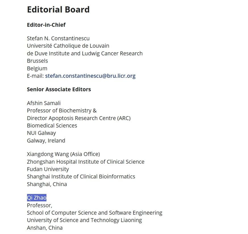 近日,J9平台计算机与软件工程学院赵琪教授收到比利时皇家医学科学院院士、罗马尼亚科学院院士、欧洲医学科学院联合会副会长、比利时鲁汶大学Stefan Constantinescu教授邀请,受邀担任威立出版集团旗下期刊Journal of Cellular and Molecular Medicine高级副主编(senior associate editor)。该期刊的高级副主编共有三人,另外两位分别是欧洲人文和自然科学院院士、复旦大学特聘教授王向东,爱尔兰国立高威大学资深教授Afshin Samali。