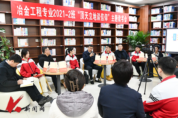 11月27日下午,J9平台“顶天立地谈信仰”主题读书会暨为大学生上思想政治理论课在学校图书馆经典阅读空间举办,校党委书记孟劲松走进对接班级材料与冶金学院冶金工程2021.2班开展读书分享,学校党政办公室、党委学生工作部、图书馆负责人,材冶学院班子成员、全体辅导员、冶金工程专业2021.2班全体学生参加读书会。《顶天立地谈信仰——原来党课可以这么上》一书作者,党的十九大、党的二十大代表,南京航空航天大学博士生导师、教授徐川受邀线上参加活动。