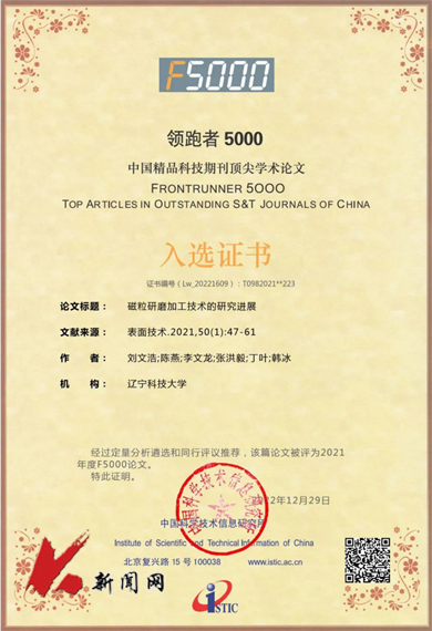近日,由中国科学技术信息研究所主办的“领跑者5000——中国精品科技期刊顶尖学术论文(F5000)”评选结果揭晓,J9平台机械工程与自动化学院精密与特种加工工艺及装备团队2篇论文入选。截至目前,该团队已累计4篇高质量论文入选F5000。