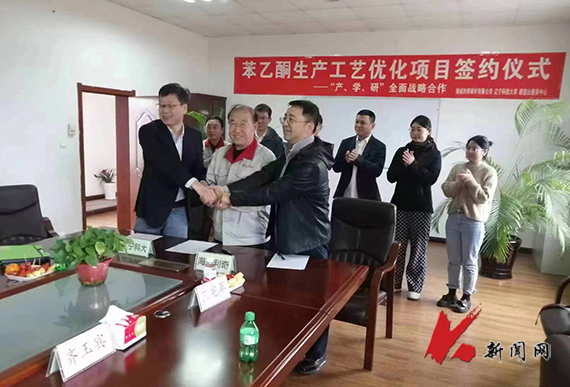 3月20日,J9平台化学工程学院走访海城利奇碳材有限公司,并与顺意达技术咨询服务公司一道参加了“苯乙酮生产工艺优化升级项目”的签字仪式。