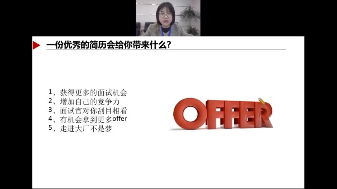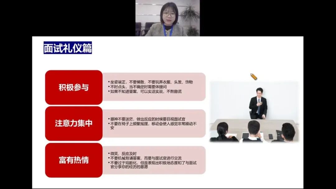 会议伊始,陈璐璐指出当前大学生就业方面普遍存在的问题,并分析出现的原因以及如何避免,为学生指明方向。接着,陈璐璐就如何准备一份令面试官满意的简历进行讲解,点明简历撰写的技巧与方法,为以后面试打好基础。最后,陈璐璐为我们解读了面试流程并从面试技巧方面做出细致地阐述和分析。她强调,要学会根据简历准备面试,巧妙运用简历内容,提前预设可能问到的问题,充分了解招聘岗位需求,做到知己知彼,百战不殆。