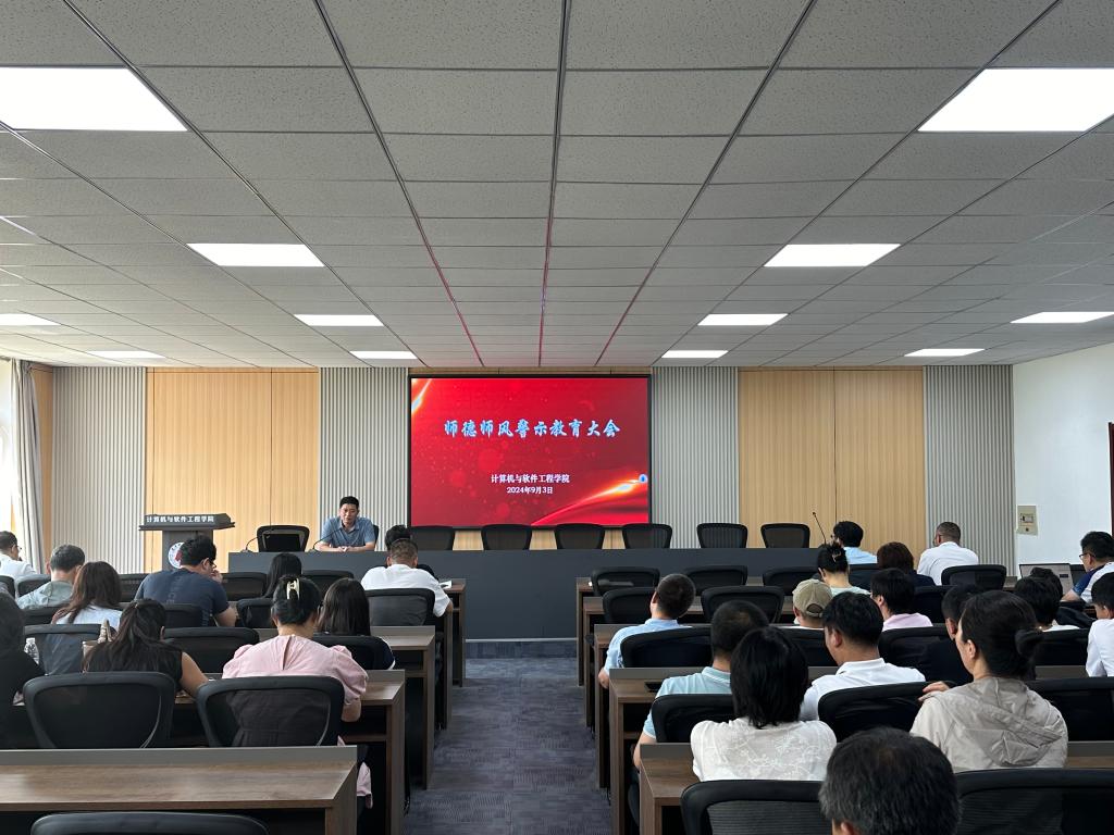 为进一步切实加强师德师风建设,弘扬教育家精神,9月3日下午,计算机与软件工程学院在博识楼335召开师德师风警示教育大会,会议由学院党委书记陶润城主持,学院全体教职工参加会议。