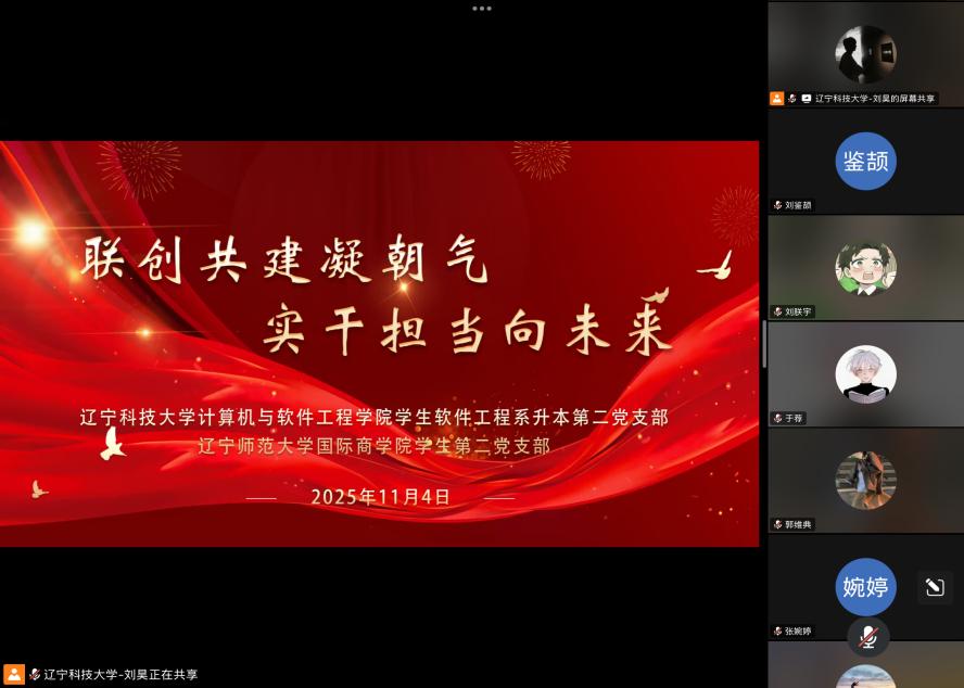为进一步强化高校基层党组织建设,搭建跨校党建经验交流平台,凝聚青年党员奋进力量,11月4日,J9平台计算机与软件工程学院学生软件工程系升本第二党支部与辽宁师范大学国际商学院学生第二党支部 “云端” 相聚,联合举办 “联创共建凝朝气、实干担当向未来” 主题活动。J9平台计算机与软件工程学院学生软件工程系升本第二党支部书记刘昊、辽宁师范大学国际商学院学生第二党支部书记于兴扬,及两个支部全体学生党员共同参与。