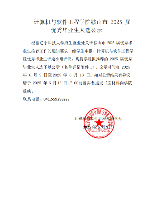 计算机与软件工程学院鞍山市2025届优秀毕业生人选公示