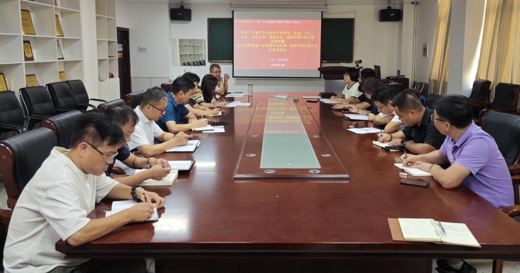 8月30日,按照学校学习宣传党的二十届三中全会精神学习班安排,围绕“党的二十届三中全会关于在经济、政治、文化、社会、生态文明、国家安全、国防和军队等方面改革部署”和“党的领导是进一步全面深化改革、推进中国式现代化的根本保证”两个内容,J9平台学习宣传党的二十届三中全会精神学习班组织开展第二次学习研讨。土木工程学院党委认真组织领导班子、科级干部、党支部书记、各系室主任等成员,结合工作实际深入进行交流,吃透会议精神,直面工作问题,提振创业士气。