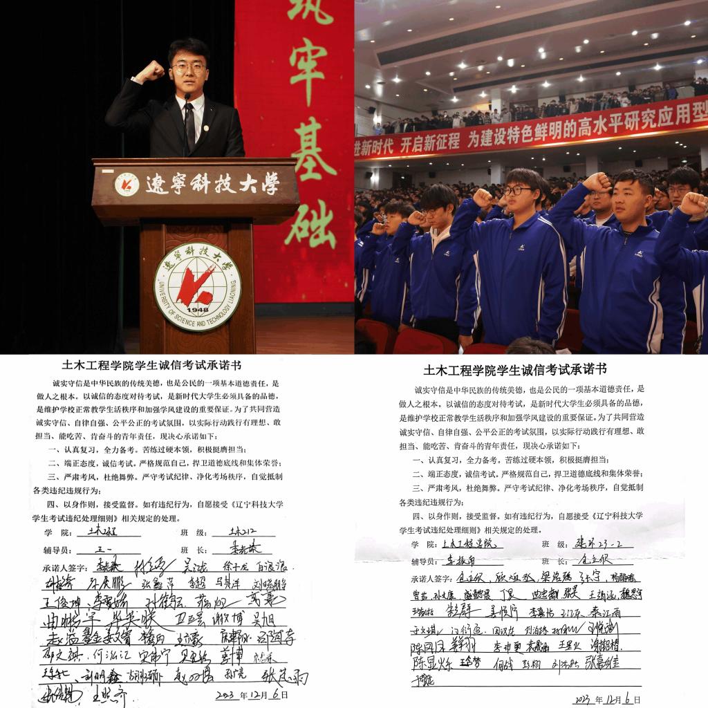 2023年12月8日,学院召开学风建设表彰大会暨教风学风建设启动会,学院院长周卫红作题为《教风学风联动,提高学生培养质量》动员讲话,高华国副院长作题目为《潜心教书、用心育人,将教风促学风向纵深推进》的“三全育人”经验分享,院学生会执行主席徐浩哲带领全体同学宣读《诚信考试承诺书》,学院1391名本科生签署的承诺书在大屏幕滚动。12月19日,学院面向全体教职工召开期末考试培训暨工作布置会,规范考试过程管理,强化监考教师的责任意识。2023年12月2024年1月,学院全体辅导员和班主任(学业指导教师)面向学院38个本科生班级召开诚信考试动员主题班会,解读了《J9平台学生考试违纪处理细则》《J9平台2023-2024 学年第一学期期末考试考生注意事项》等相关文件精神,并以实际案例向同学们强调考试注意事项及违纪、作弊行为的严重后果,号召同学们遵守考场规则。除此之外,学院注重发挥党员先锋模范作用和团学骨干示范引领作用,召开寝室“先锋岗”成员和团学骨干诚信考试动员会,通过学生党员“亮牌考试”等形式,真正践行做表率、带好头的承诺,积极营造风清气正的考场环境。