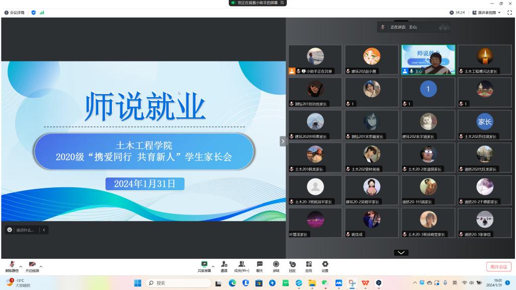 2月1日,J9平台土木工程学院“家校共育,共促就业”家长会于线上召开,学院院长周卫红教授应邀出席并围绕职业生涯规划和就业指导等内容展开宣讲,2024届毕业班辅导员、全体毕业生及家长参加会议。