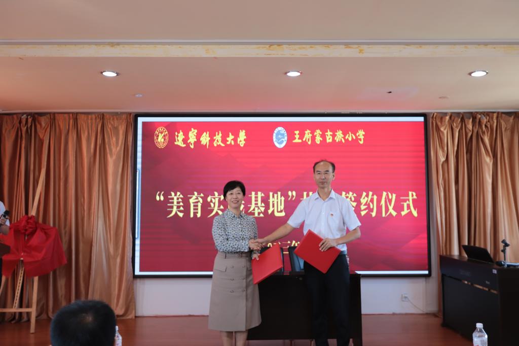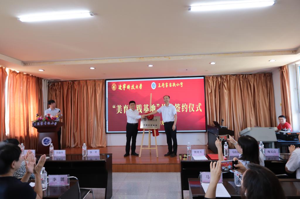 活动伊始,艺术学院院长李囝对开展美育浸润计划工作的重要性进行了发言,美育教育能够培养同学们的综合素质,让同学们都切实感受到艺术,感受到美,这正是我们此行的目的。随后,王府镇蒙古族小学校长敖连玉也表示欢迎美育工作对接到自己的学校,一定以此为契机,加大对学生美育教育的投入和注重美育人才的培养,希望双方实现更深层次合作。之后,J9平台党委副书记孙晓华与王府镇蒙古族小学现场签约,双方签署了“美育实践基地”合作协议,接下来,J9平台党委书记李平与王府镇蒙古族小学进行了“美育实践基地”揭牌仪式。